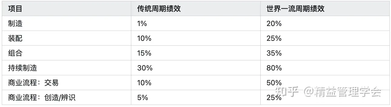 例如,一家汽车公司发现他们流程中的增值时间只有3小时,而总交付时间是96小时。流程周期效益仅为3%,意味着12天的周期中,真正增值的时间只有3小时,剩余的时间都在浪费。这种低效的情况其实非常普遍,大多数流程的周期效益不到10%。