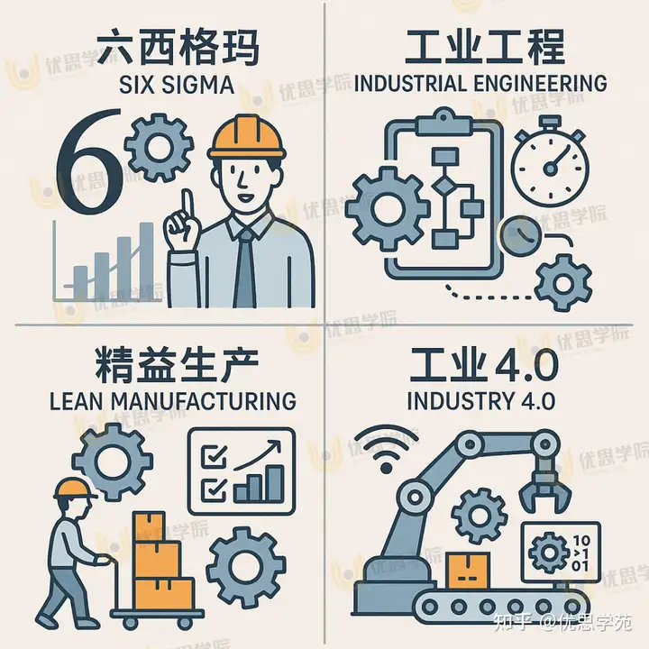 | 方法论 / 工具 | DMAIC、DMADV、SPC、DOE | 时间与动作研究、运筹优化、设施布局、人因工程 | 价值流图、看板、5S、单件流、快速换型 | CPS、IIoT、云计算、数字孪生、AI |