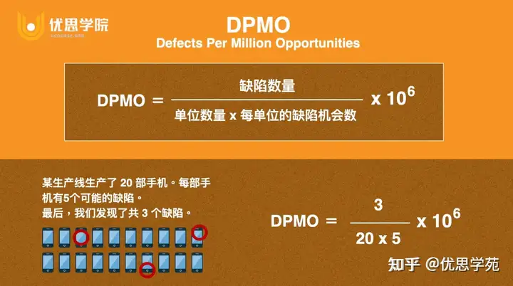 至于「六是什么意思?」由上图优思学院课程中可知,如果公司仅有两个标准差,就表示每 100 万次操作机会中,会有约 30 万次误差数。以此类推,当公司做到六西格玛就可说是近乎完美地达成顾客要求,亦即每百万次操作中,仅有 3.4 次缺失数,达到 99.9997%的良率。以每百万机会的缺失数(Defects Per Million Opportunities,DPMO)来表达制程的质量水准,如优思学院下图公式: