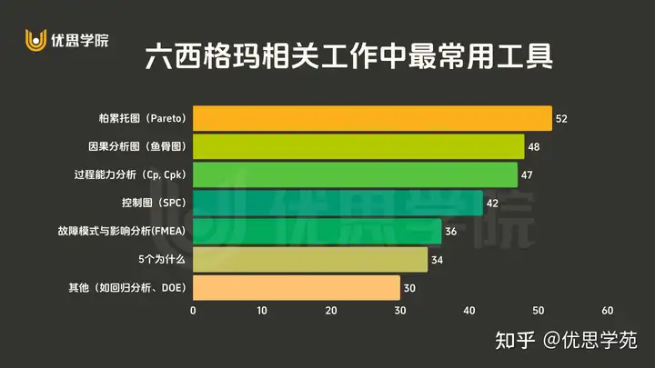 工具使用频率柏累托图(Pareto)52 因果分析图(鱼骨图)48 过程能力分析(Cp, Cpk)47 控制图(SPC)42 故障模式与影响分析(FMEA)365 个为什么 34 其他(如回归分析、DOE)低于