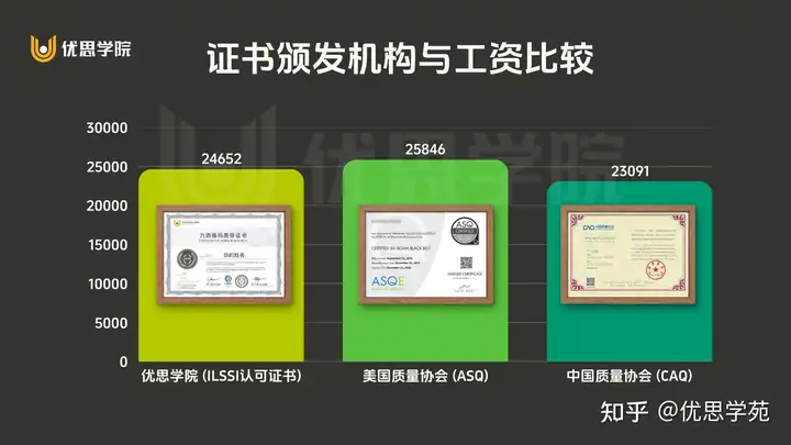 很多人关心,不同机构颁发的六西格玛证书含金量会不会不一样?从数据来看,答案是否定的。无论是 优思学院(ILSSI 认证证书)、美国质量协会(ASQ),还是 中国质量协会(CAQ),持证者的平均工资水平差距并不大,都在相近区间内波动。