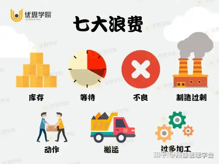 说完五大工具,再来看七大手法。这七个手法专治生产里的“七宗罪”——七种浪费:过量生产、等待、运输、加工、库存、移动、不良品。丰田的工程师们真是聪明,把浪费归类得像七个小矮人,每一个都得收拾得服服帖帖。