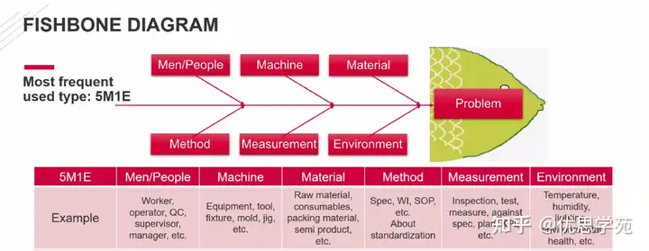 5M1E,指的是人(Man),机器(Machine),物料(Material),方法(Method),环境(Environments),测量(Measure)简称:人、机、料、法、环、测。