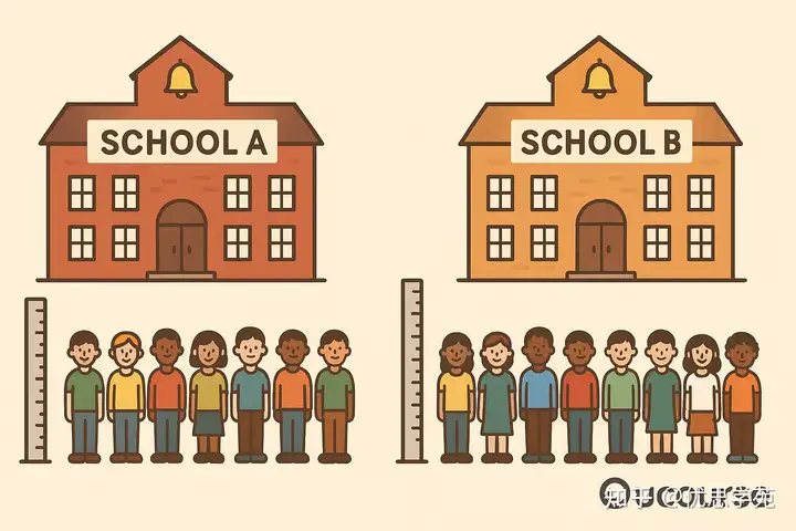 想像你统计了一组数据,例如比较两所学校学生的身高。你在 A 学校量了10个人,在 B 学校也量了10个人。结果发现两组的平均身高有些差异。