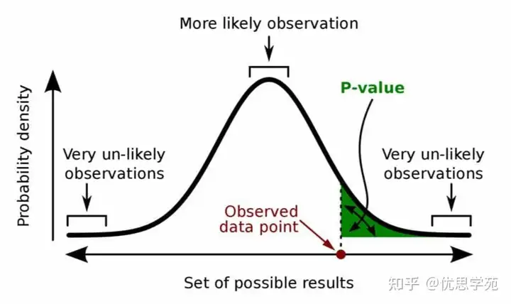 p 值(绿色阴影区域, 上图)是在原假设为真的前提下,出现某个观测结果(或更极端结果)的概率。