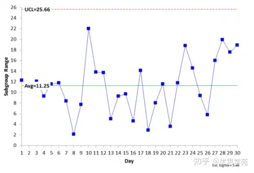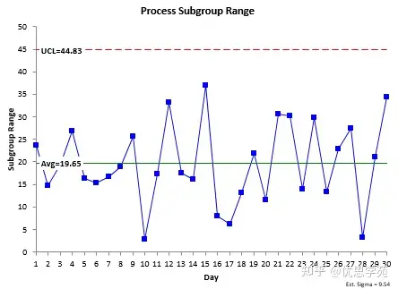 现在我们看 σ,也就是通常说的组内变差(within subgroup variation)。这个 σ 是从极差控制图(range control chart)估出来的流程标准差。