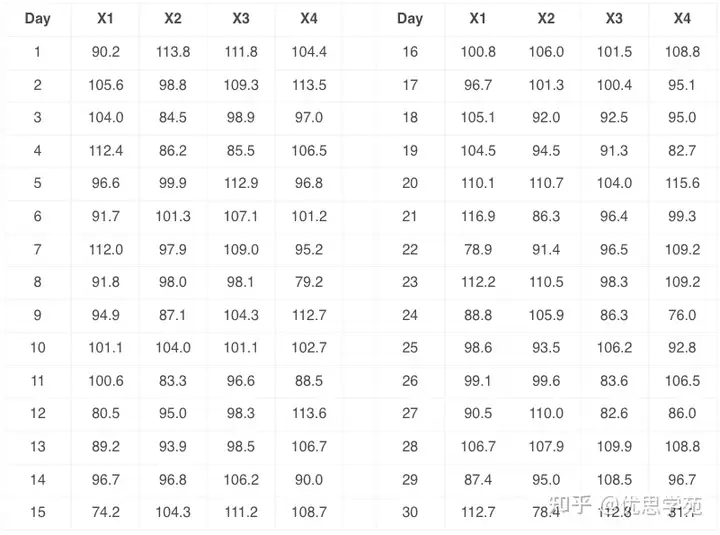 我们来看两个流程(Process 1 和 Process 2),它们的数据来源完全一样(数据取自上一期文章),只是排序不同。假设你每小时取 4 个样本,组成一个亚组。你想判断这个流程能否满足规格要求:LSL = 65,USL = 145。流程1的 30 个亚组数据见表2(略)。