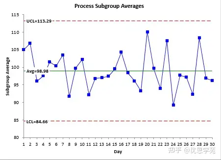 接下来算 Cpk 还需要一个流程平均值,这个来自 X̅ 控制图。流程1的 X̅ 图如图6所示。