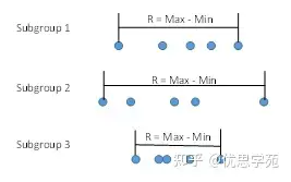 比如,你用的是 X̅-R 控制图,子组(subgroup)大小为5。每次抽 5 个样本,这 5 个点的平均值就是 X̅,画在 X̅ 图上;这 5 个点的极差 R = 最大值 − 最小值,画在 R 图上(见图3)。R 就是这个亚组内部的变差度量。