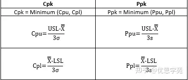 Cpk 和 Ppk 都是“两个能力指数中的较小值”。它们的公式如下:
