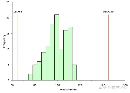 现在你用表2的数据画一个直方图,用表3的数据再画一个直方图,然后加上规格限 LSL = 65,USL = 145。你会发现,两张直方图一模一样——这很正常,因为数据是完全相同的一套。图4就是这个直方图。