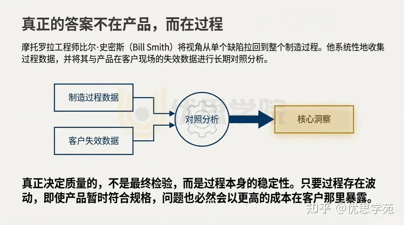 作为摩托罗拉的工程师,比尔·史密斯并没有把注意力放在单个缺陷上,而是把视角拉回到整个制造过程。他系统性地收集过程数据,将制造阶段的缺陷记录,与产品在客户现场的失效数据进行长期对照分析。