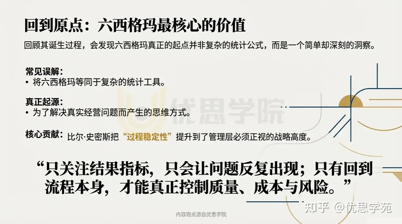 优思学院指出,比尔·史密斯当年的贡献,并不在于发明了某一个公式,而在于他把“过程稳定性”提升到了管理层必须正视的高度。他让企业意识到,只关注结果指标,只会让问题反复出现;只有回到流程本身,才能真正控制质量、成本与风险。