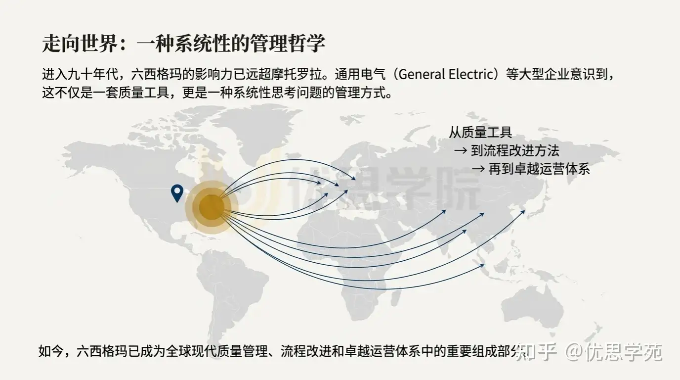 随着通用电气等企业的大规模推广,六西格玛迅速走向全球,成为现代质量管理、流程改进和卓越运营体系中的重要组成部分。