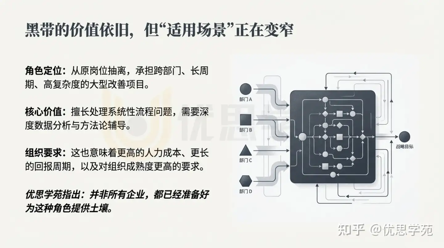 当组织的业务节奏、绩效机制与权责结构,并未围绕持续改善进行设计时,黑带很容易陷入“项目做完,人却无处安放”的处境。