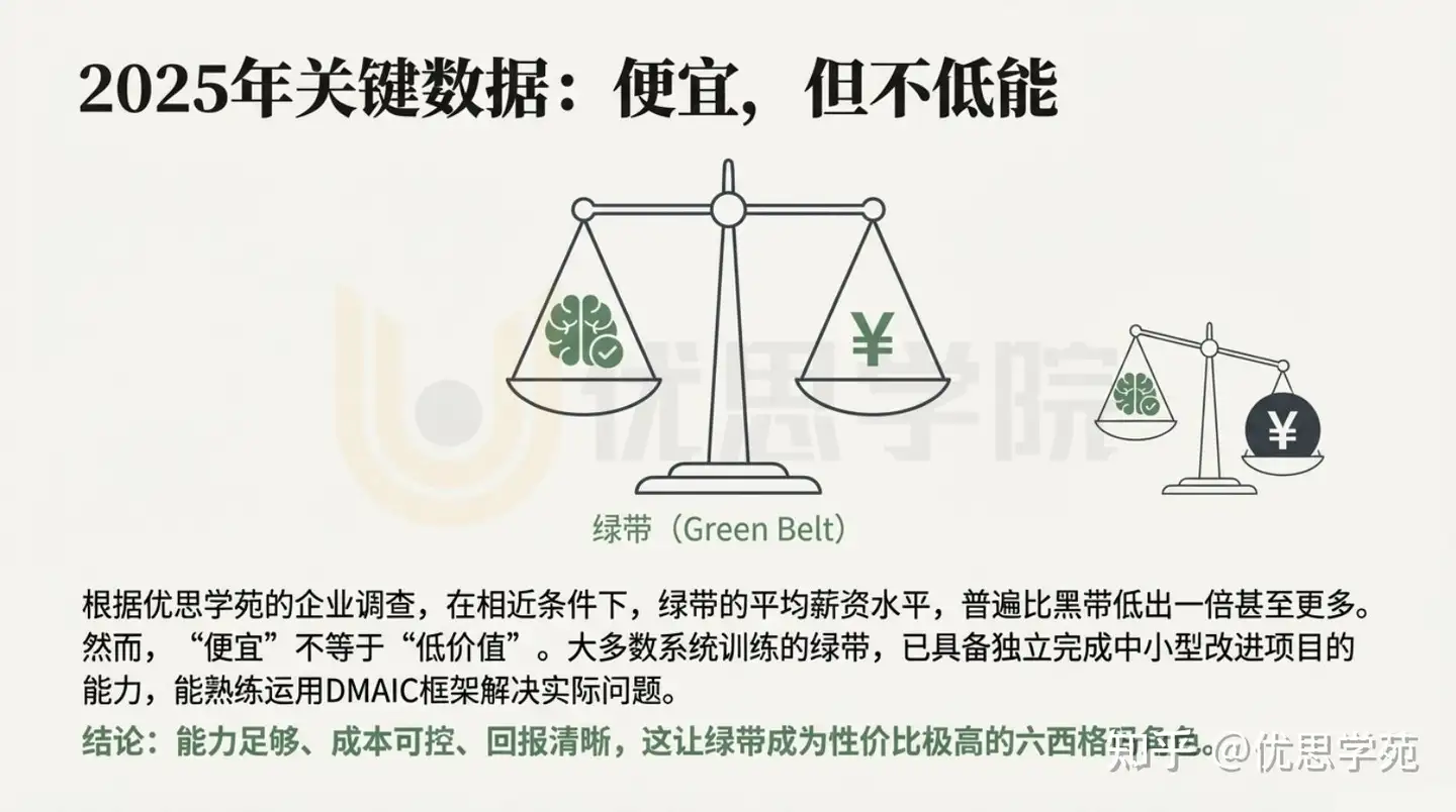 在优思学院2025年的企业调查中,有一个数据格外醒目:在相近行业与地区条件下,绿带的平均薪资水平,普遍比黑带低出一倍,甚至更多。