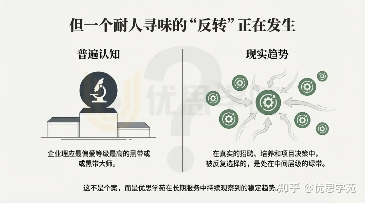 按照传统认知,等级越高,价值越大,企业理应更偏爱黑带,甚至黑带大师。但现实却出现了一个耐人寻味的反转现象:在大量企业的真实用人决策中,被反复选中的,并不是最高等级的黑带大师,而是处在中间层级的绿带。