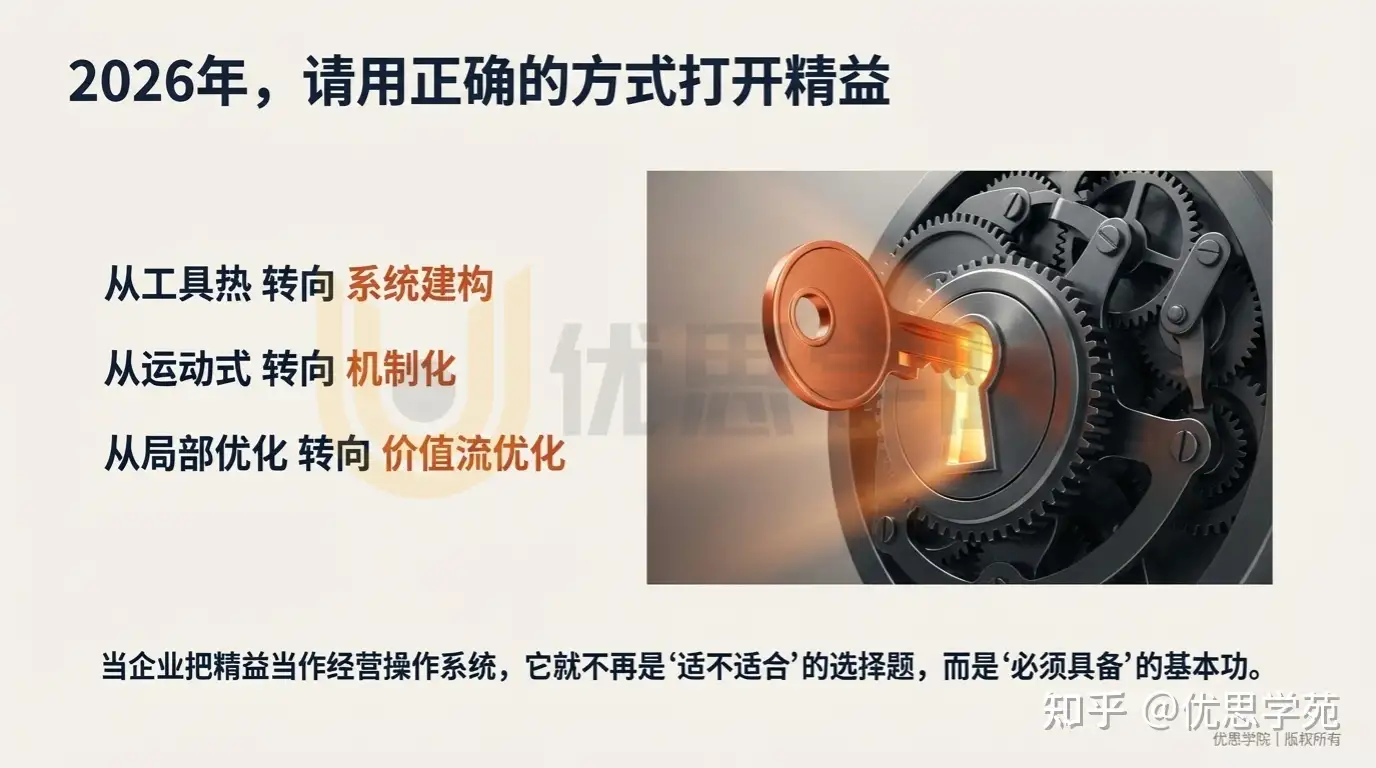 所以,2026 年精益管理是否适合中国企业?答案是适合,而且更适合;但前提是企业必须从三件事上完成转向:从工具热转向系统建构,从运动式转向机制化,从局部优化转向价值流优化。