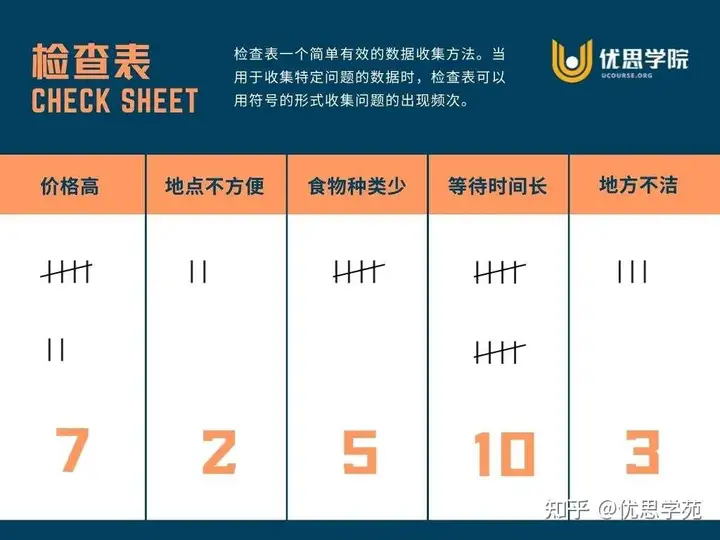 检查表是一种简单但强大的工具,用于收集、组织和分析数据,它用简单的数据,以通俗易懂的方式制作图表或表格,必要时写下检验标记,并做好统计,以便进一步分析或检查。任何问题的解决或流程改进都必须基于数据,而检查表能帮助快速收集高质量数据。