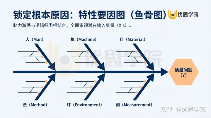 特性要因图(石川图)是防止团队过早下结论的“思维刹车”。它引导我们从 “人、机、料、法、环、测” 六大维度穷举潜在的 关键过程输入变量(KPIV)。