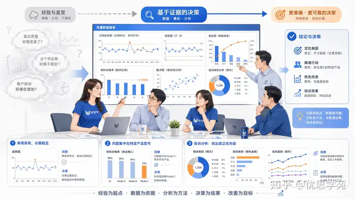 优思学院认为,这条原则其实也解释了为什么质量领域会经常用到 KPI、SPC、审核结果、顾客满意度调查、不良率、返工率、交付达成率、供应商绩效等工具和指标。它们不是为了把管理搞复杂,而是为了让决策更可靠。